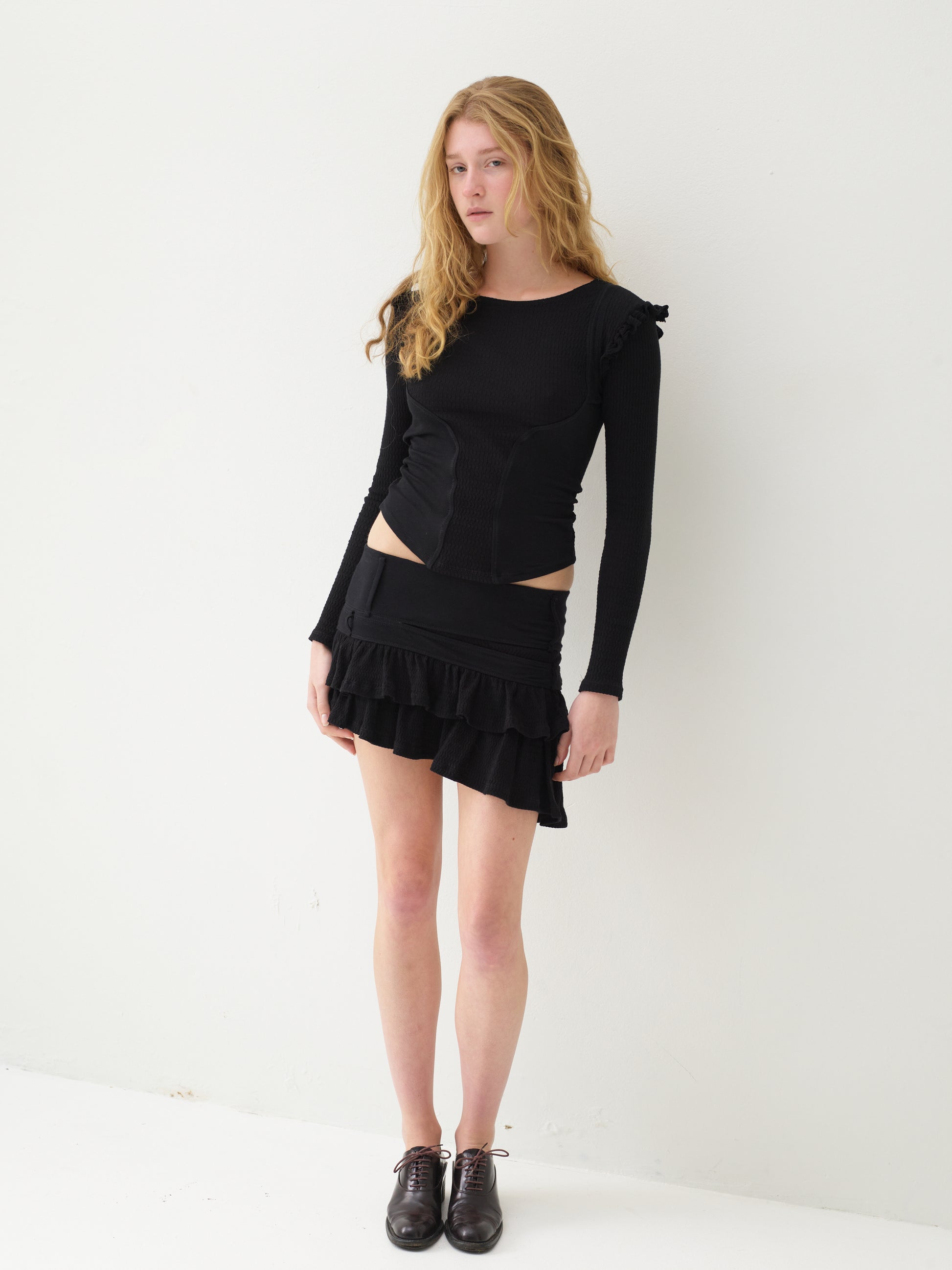 Long sleeve top featuring contrast panelling decorated with superimposed top stitching at front and back. Curved hemline. Adjustable ties that cinch in waist from back. Frill detail at shoulders.